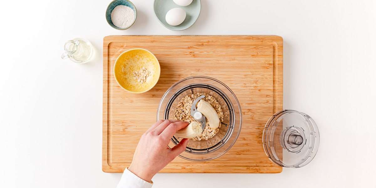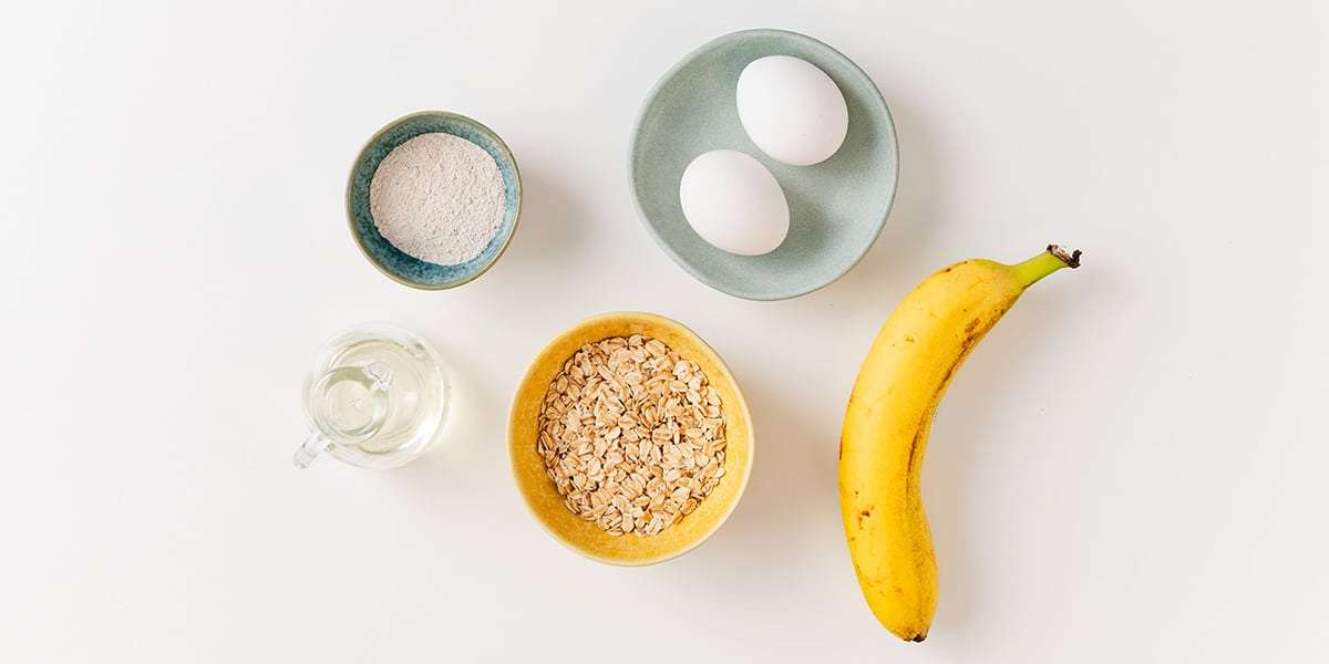 Für unsere Bananenpfannkuchen reichen 4 Zutaten völlig: Banane, Ei, Haferflocken und ein bisschen Vollkornmehl. Einfach alles zusammenmixen und ab in die Pfanne.