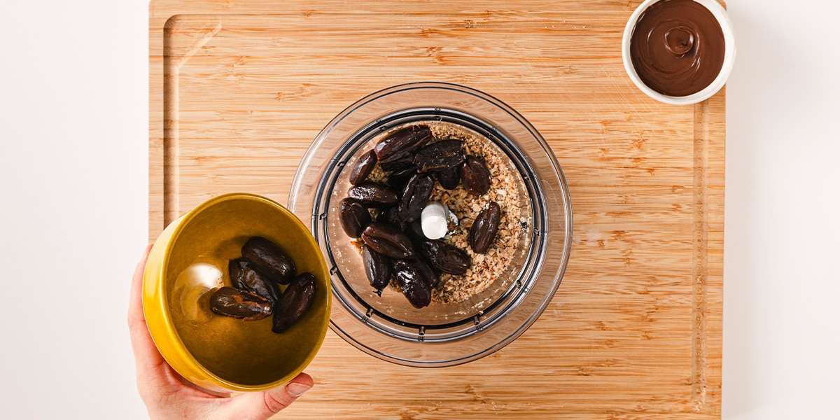 Nüsse in einer Küchenmaschine oder einem Zerkleinerer grob mahlen. Datteln, Kakaopulver, Salz und optional 1 TL frischen Orangenabrieb hinzufügen und alles zu einer klebrigen Masse verarbeiten.