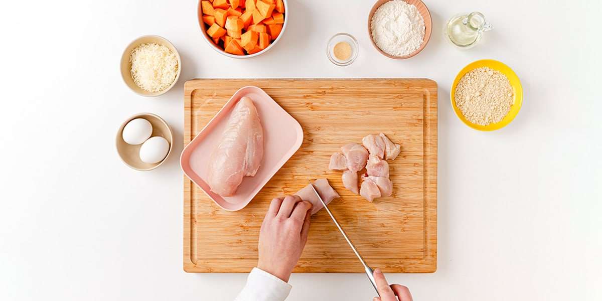 Die Bio-Hähnchenbrust in nuggetgroße Stücke schneiden.