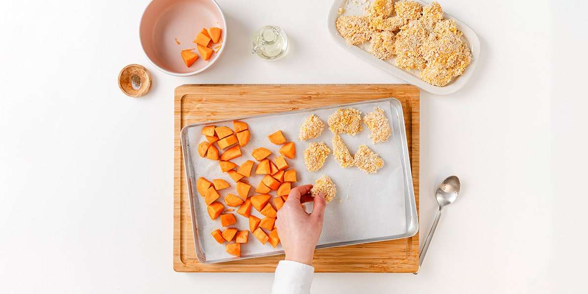 Die Nuggets und die Süßkartoffeln auf ein Blech legen, die Süßkartoffelwürfel mit Öl, Salz und Pfeffer würzen.