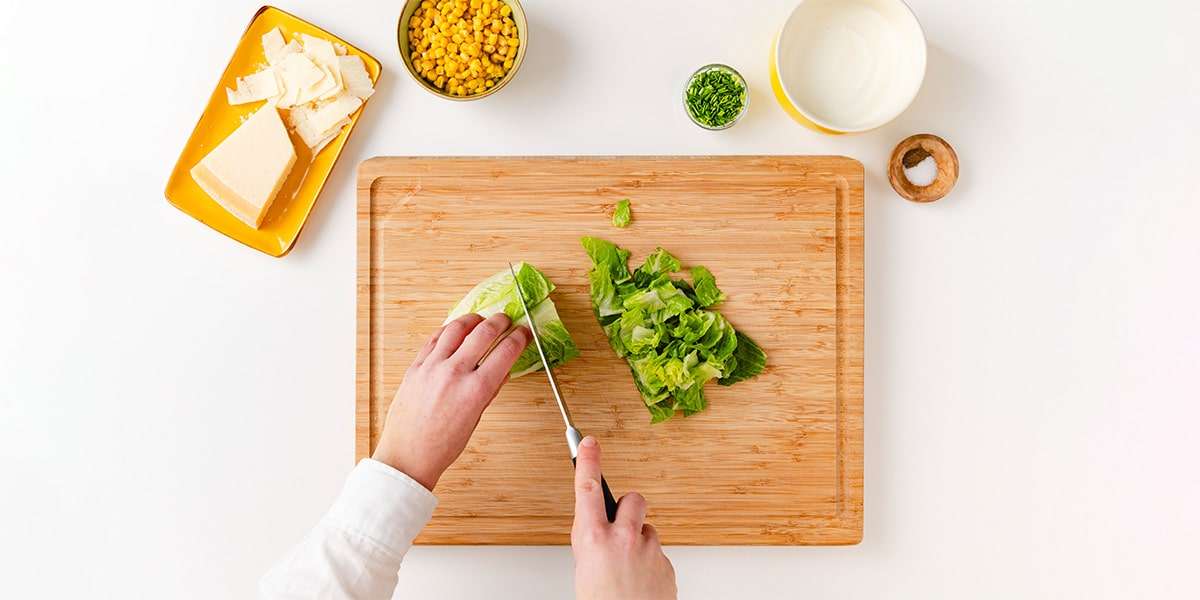 Inzwischen den Salat in mundgerechte Stücke schneiden. Joghurt mit Schnittlauch verrühren und mit Salz und Pfeffer abschmecken.