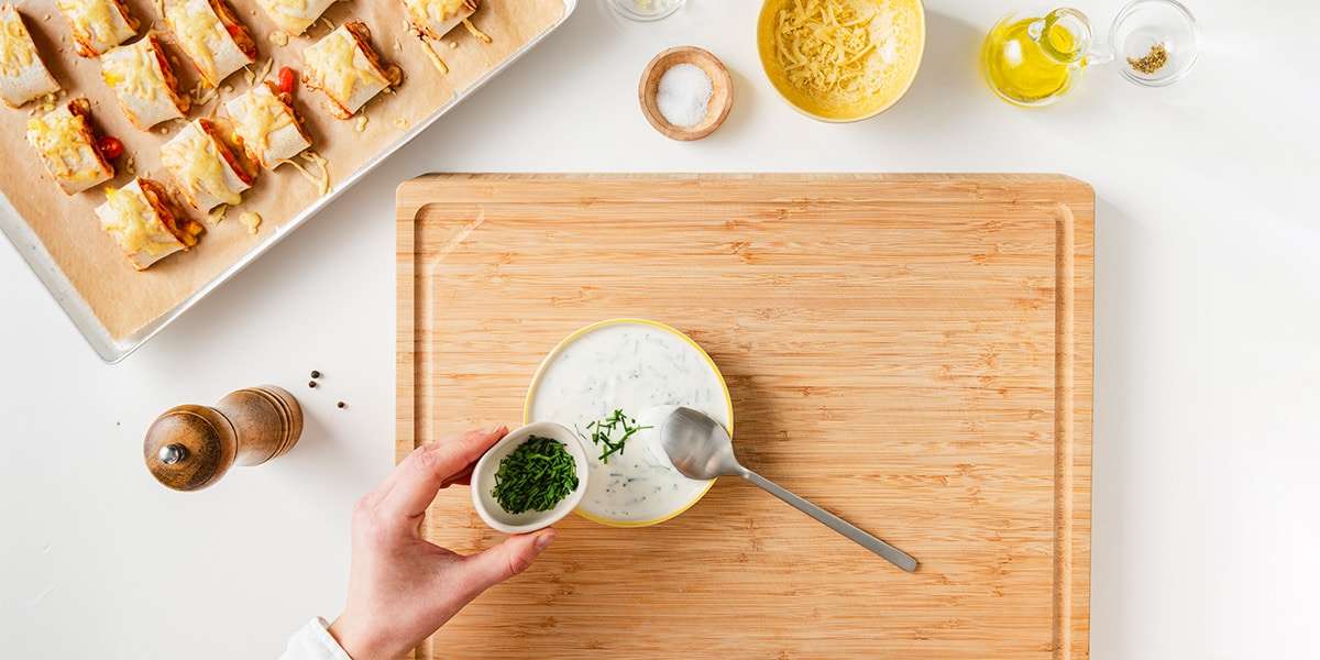 Die fertigen Wrap Pizzaschnecken mit dem Joghurt-Dip servieren und genießen.